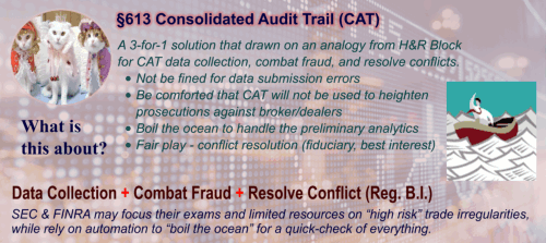 The Flash Crash and market surveillance drivers propelled CAT as a mission critical project for the SEC. It will cost several hundred million dollars to build. The expected annual maintenance cost is more than a billion dollars. We despise the unnecessary duplicating or triplicating of data that increases vulnerability of hackers’ attacks. We also despise the burden on broker-dealers to report data to a “stale vault” when data could have been analyzed directly at its originating source. Given that, we have a solution that draws on an analogy from H&R Block for CAT and combating fraud.
